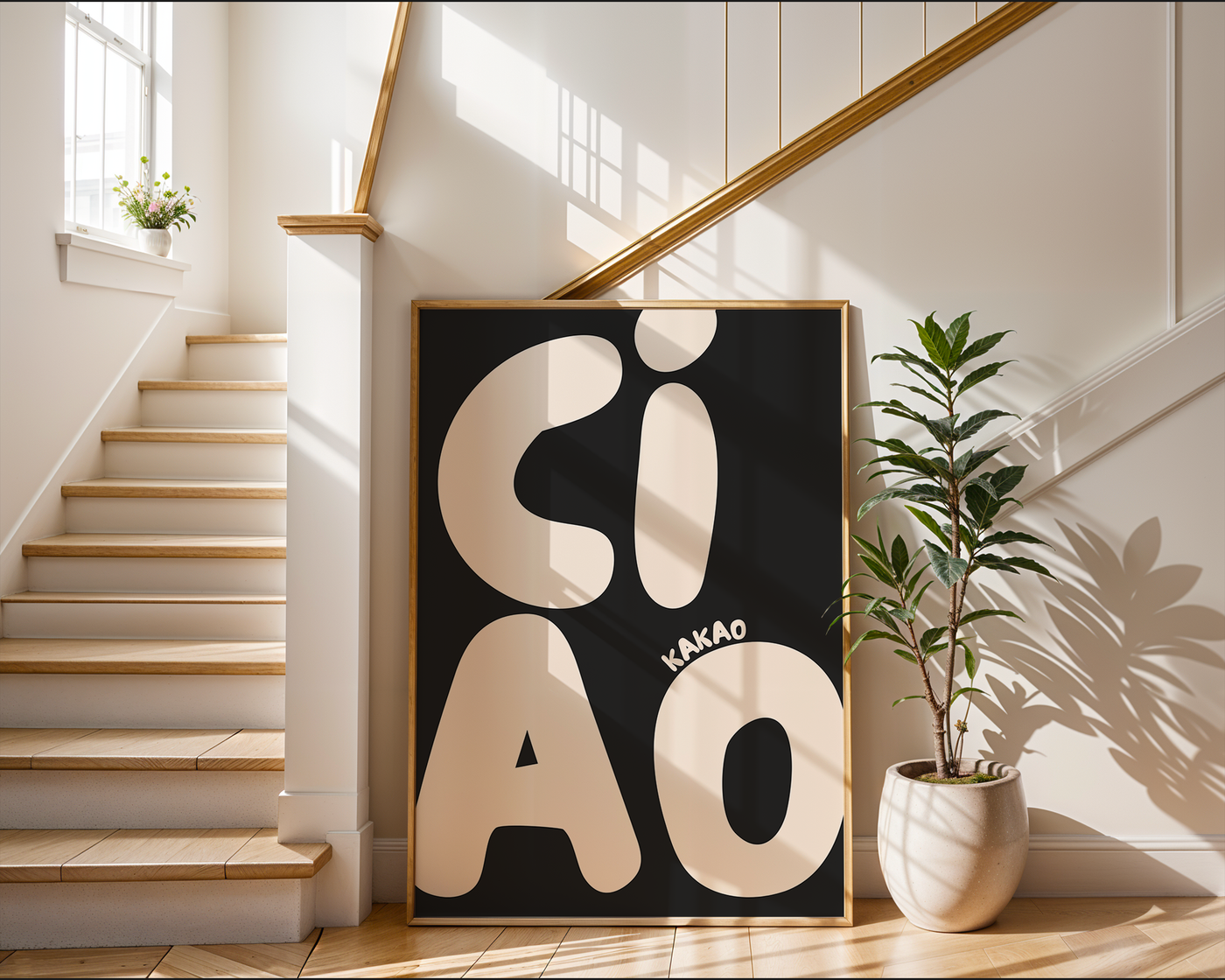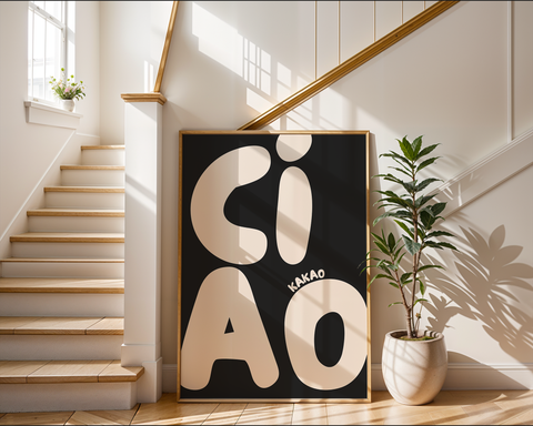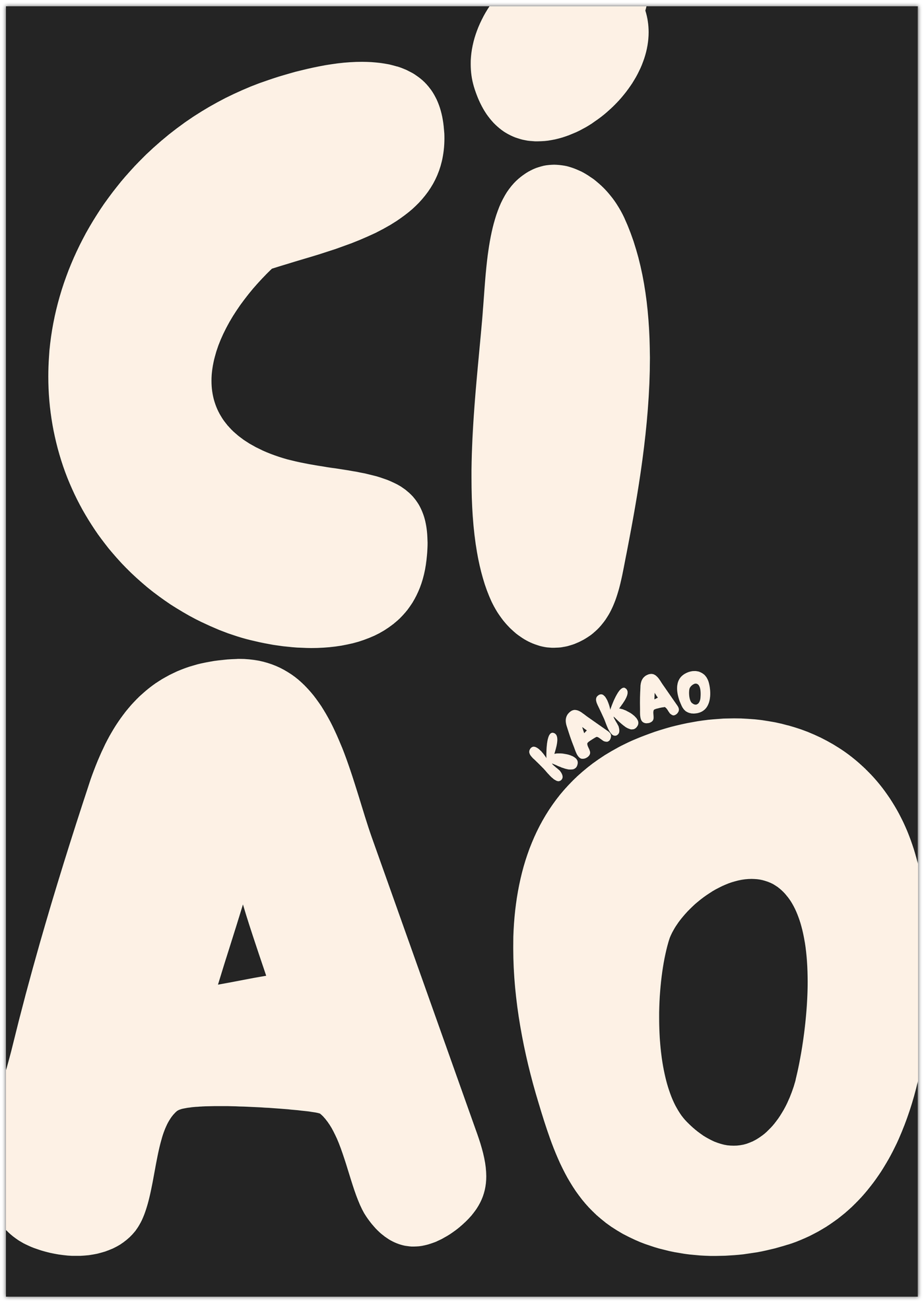 Minimalistisches Typografie-Poster in Schwarz- und Beigetönen. Das moderne Design mit dem Schriftzug „Ciao Kakao“ setzt einen stilvollen Akzent und bringt ein trendiges Retro-Flair in Ihre Einrichtung.
