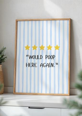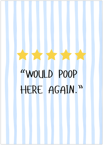 Mach dein Gäste-WC oder Badezimmer zum absoluten Hingucker!Dieses humorvolle Poster zeigt eine 5-Sterne Bewertung mit dem Spruch „Would poop here again“ – schlicht, modern und garantiert ein Lacher bei jedem Besuch.
