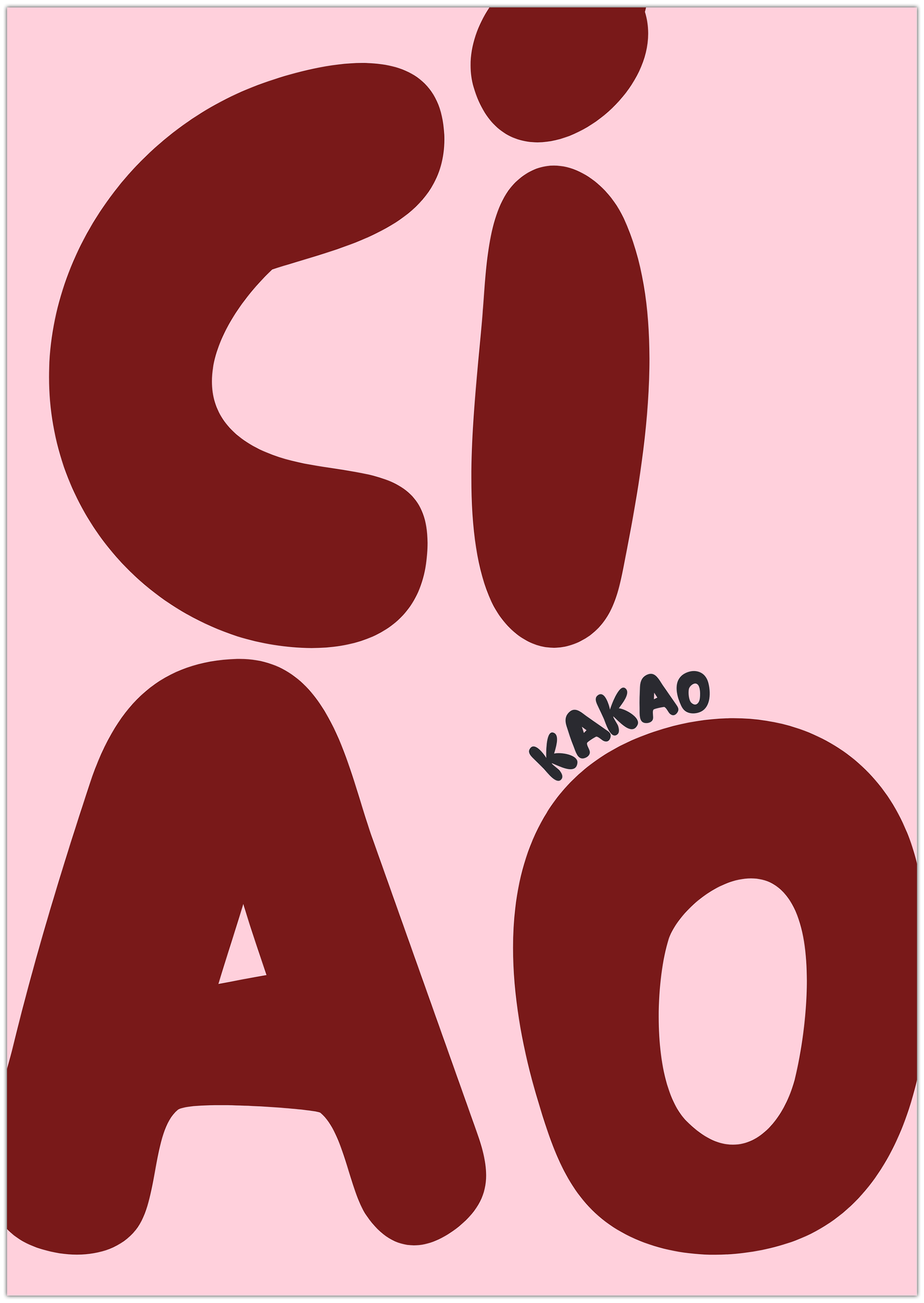 Modernes Typografie Poster mit rosa Hintergrund und bordeauxrotem Schriftzug „Ciao Kakao“. Die warme Farbkombination verleiht diesem Wandbild einen trendigen, verspielten Charakter und bringt frische Akzente in jedes Zuhause.