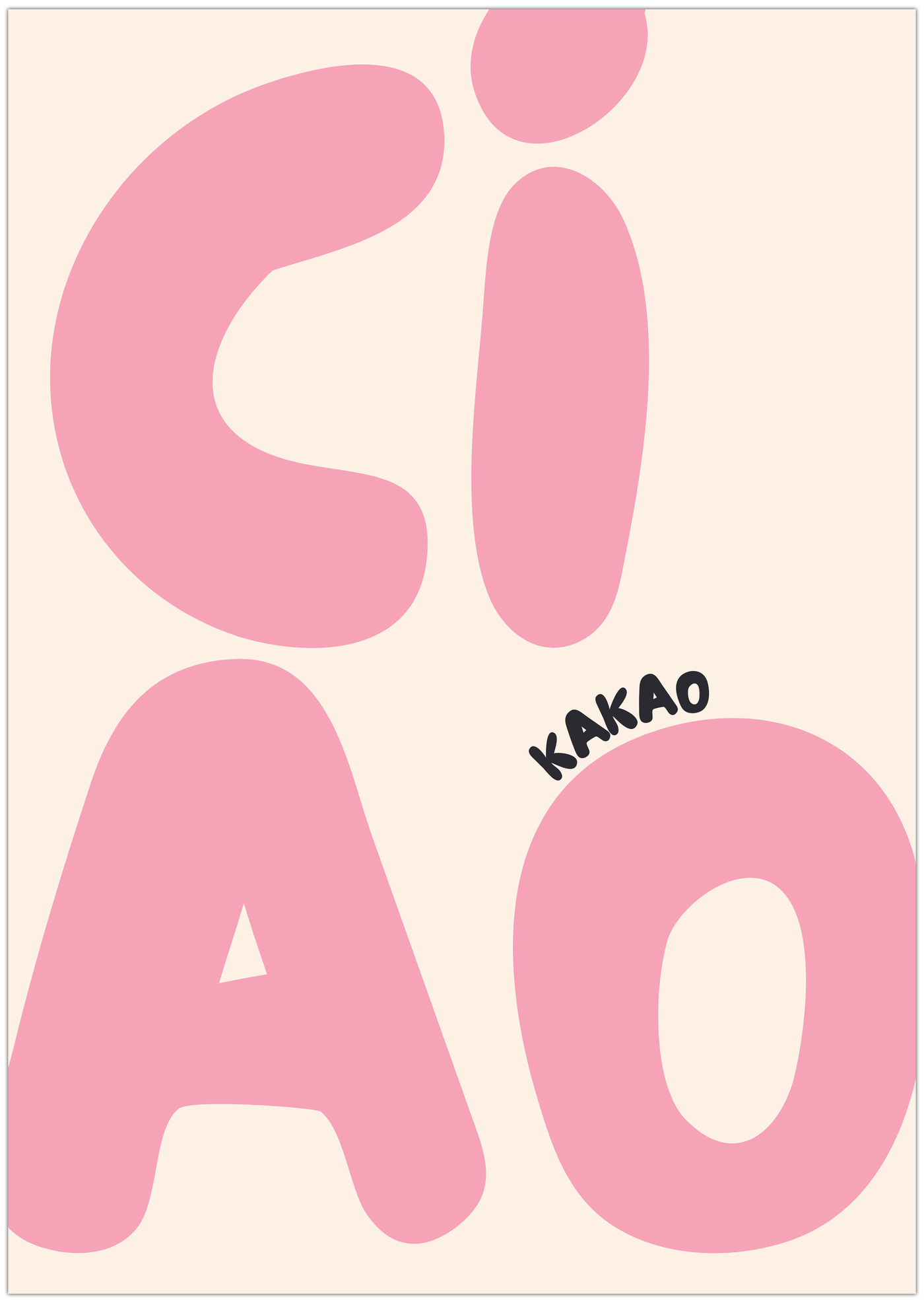 Minimalistisches Typografie Poster in sanften Rosa - und Beigetönen. Das moderne Design mit dem Schriftzug „Ciao Kakao“ setzt einen stilvollen Akzent und bringt ein trendiges Retro-Flair in deine Einrichtung.