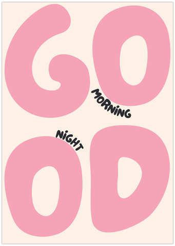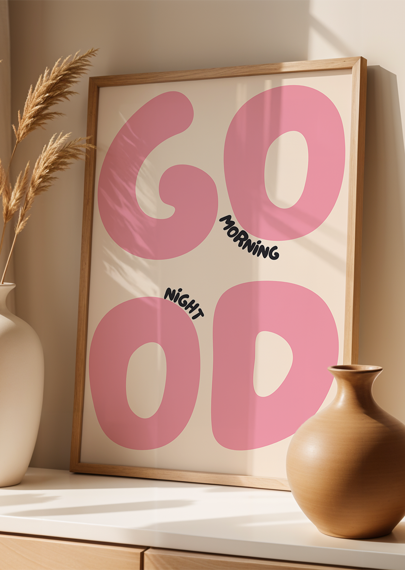 Minimalistisches Typografie Poster in warmen Rosa- und Beigetönen. Das moderne Design mit dem Schriftzug „Good Morning Night“ setzt einen stilvollen Akzent und bringt ein trendiges Retro-Flair in deine Einrichtung.