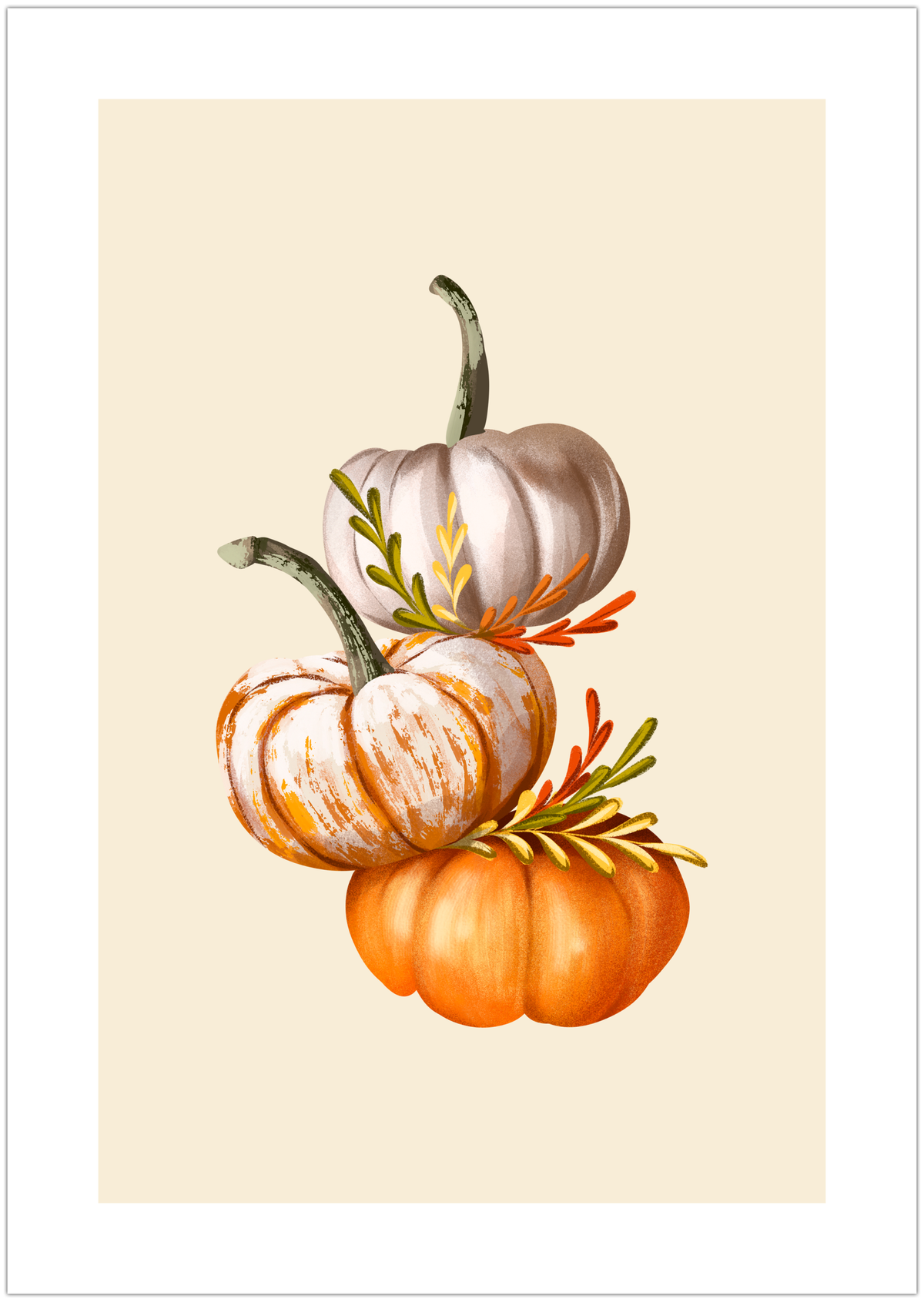 Hole dir die volle Herbststimmung nach Hause mit diesem liebevoll gestalteten Pumpkin Trio Poster. Drei stilvolle Kürbisse in warmen Herbstfarben bringen Gemütlichkeit und saisonales Flair in jeden Raum – perfekt für Wohnzimmer, Küche oder Leseecke.